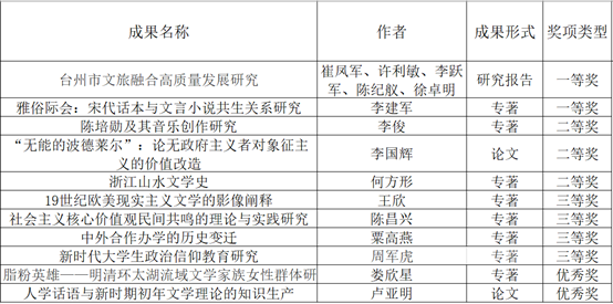 梅花香自苦寒来,以上奖项都是我校人文社科学者长期研究的成果结晶。崔凤军教授团队的系列咨询报告《台州市文旅融合高质量发展研究》是其多年研究地方产业的硕果,是学校打造校地“命运共同体、利益共同体、奋斗共同体”的生动体现。人文学院李建军教授的专著《雅俗际会:宋代话本与文言小说共生关系研究》由中央级出版社中华书局出版,李国辉教授的论文《“无能的波德莱尔”:论无政府主义者对象征主义的价值改造》发表于权威期刊《外国文学评论》,二人所受资助的国家社科基金一般项目都是优秀等级结题。其他获奖成果也多为省部级科研项目的成果,展现了我校优秀科研工作者的风采。
