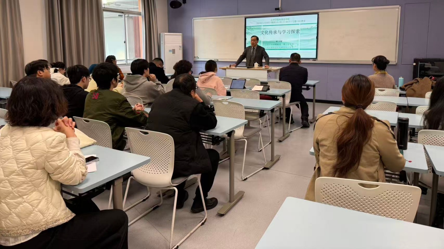 2025年11月20日下午,台州学院外国语学院特邀山东大学特聘教授时卫国教授,围绕“文化传承与学习探索”主题开展专题讲座。本会议由刘芬教授主持,学院教师和研究生参会。